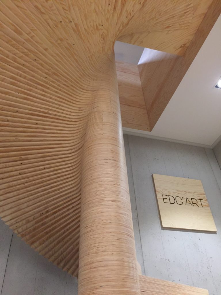 L’escalier est en fait une suite de 180 couches de multiplex sapin afin d’arriver à l’étage, une poutrelle métallique de six mètres de haut en son centre maintient le tout.